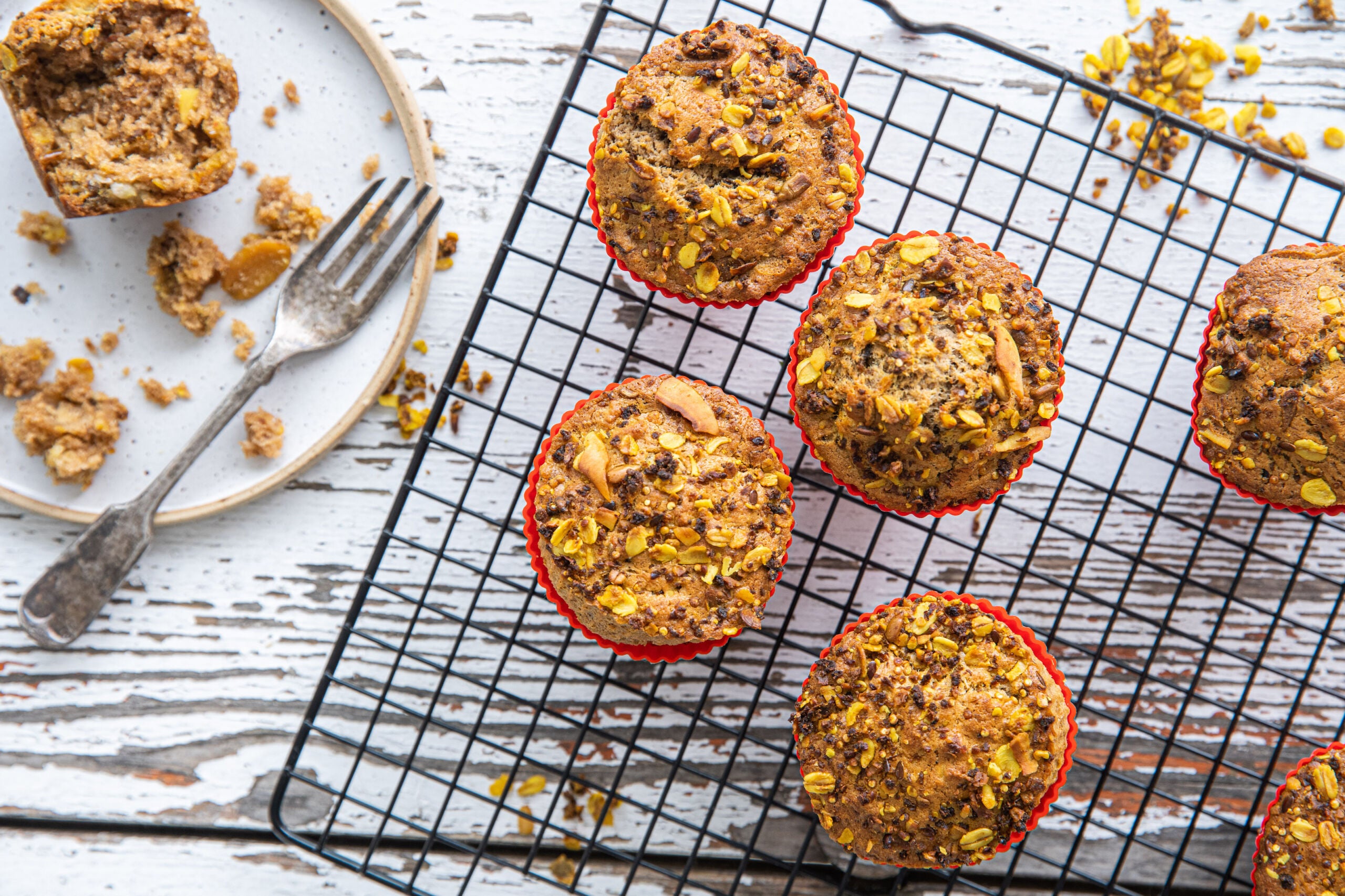 Vul de 8 muffin vormen en werk af met wat granola on top.