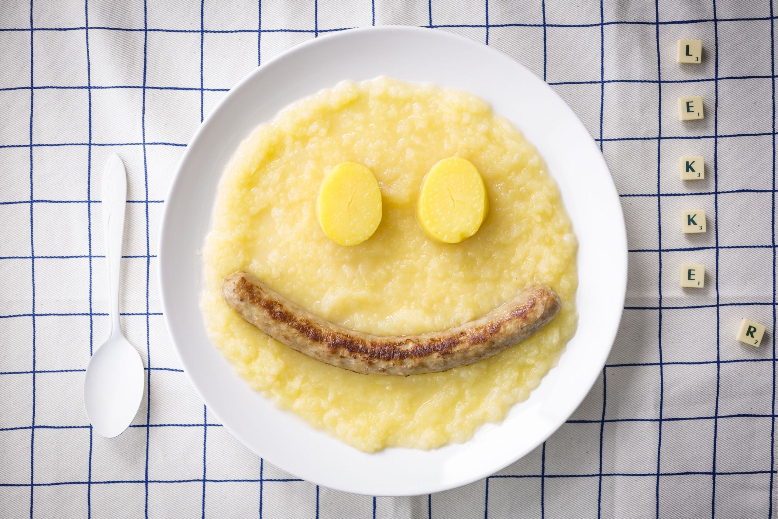 Lepel de fruitmoes in cirkelvorm op een bord. De worst wordt een mond en de aardappelen ogen.