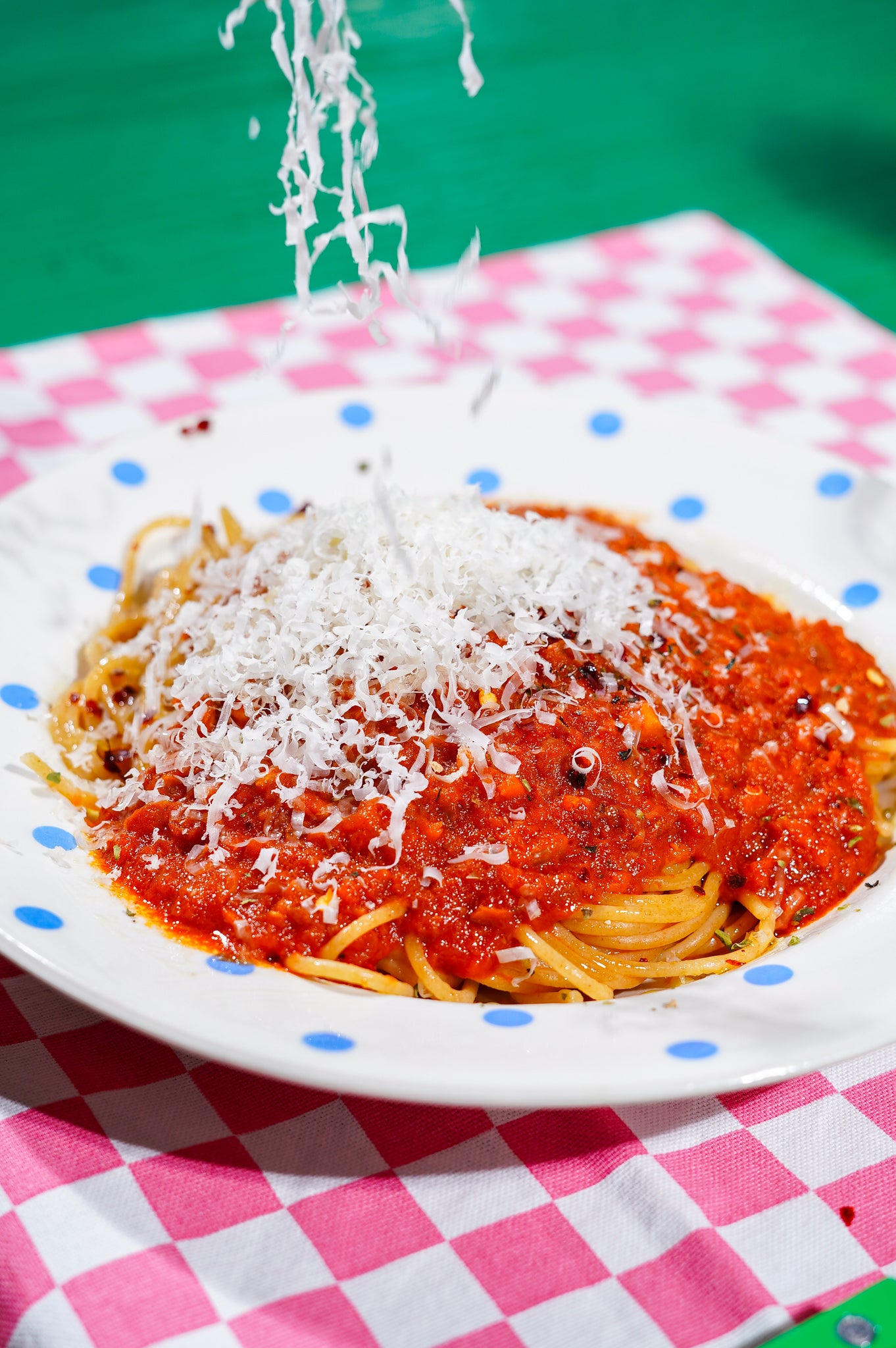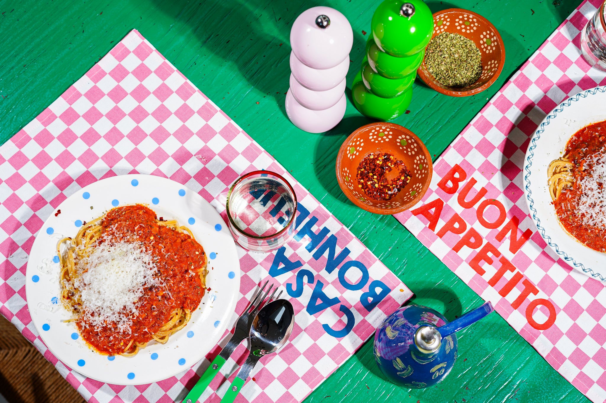 Serveer de pasta met een flinke lepel saus erbovenop. Extra chili flakes, oregano en wat druppels olie. Werk eventueel af met wat geraspte kaas.