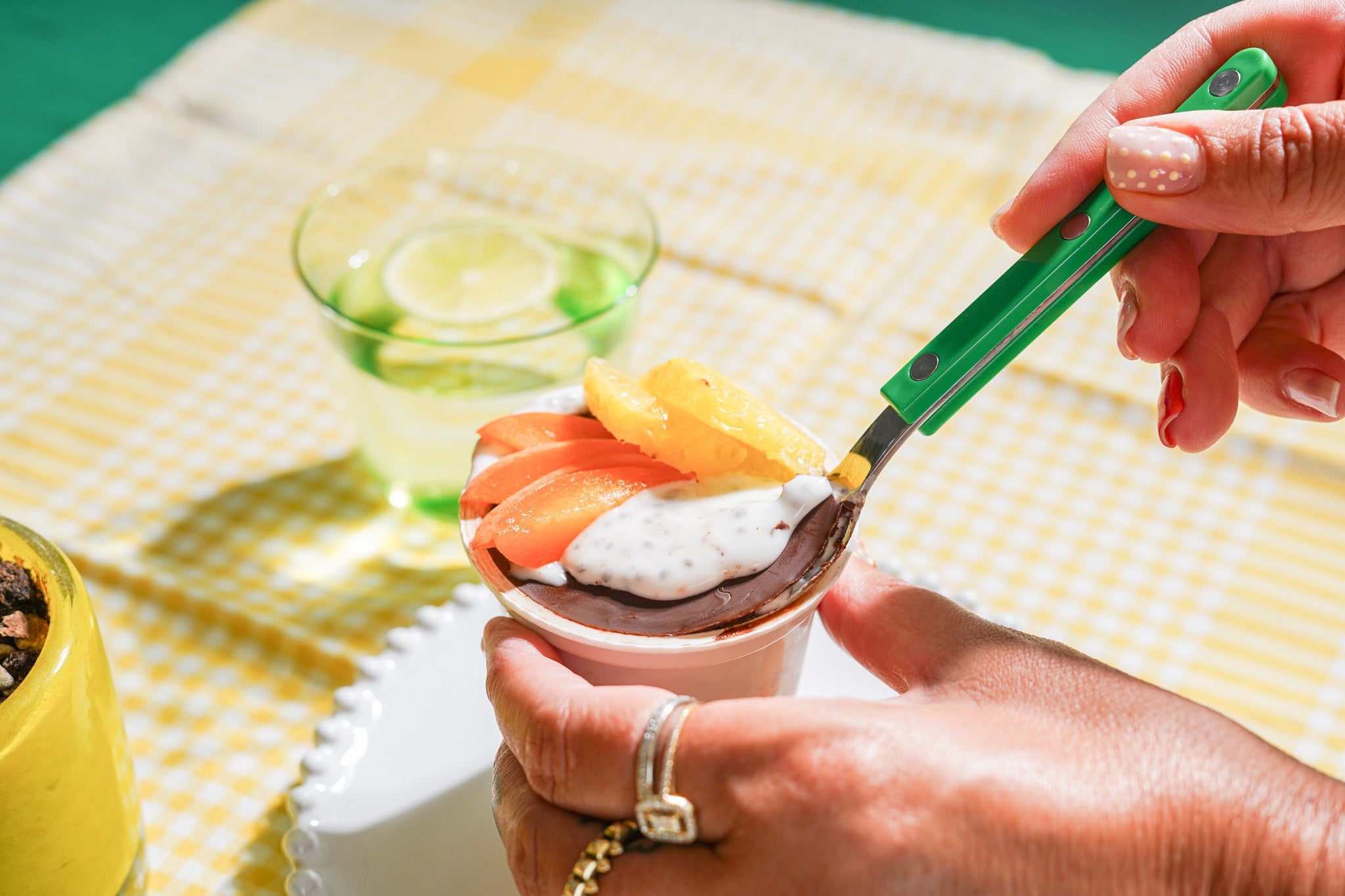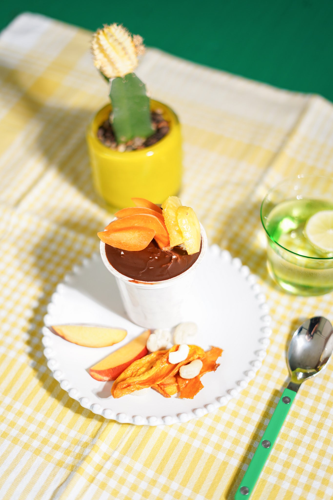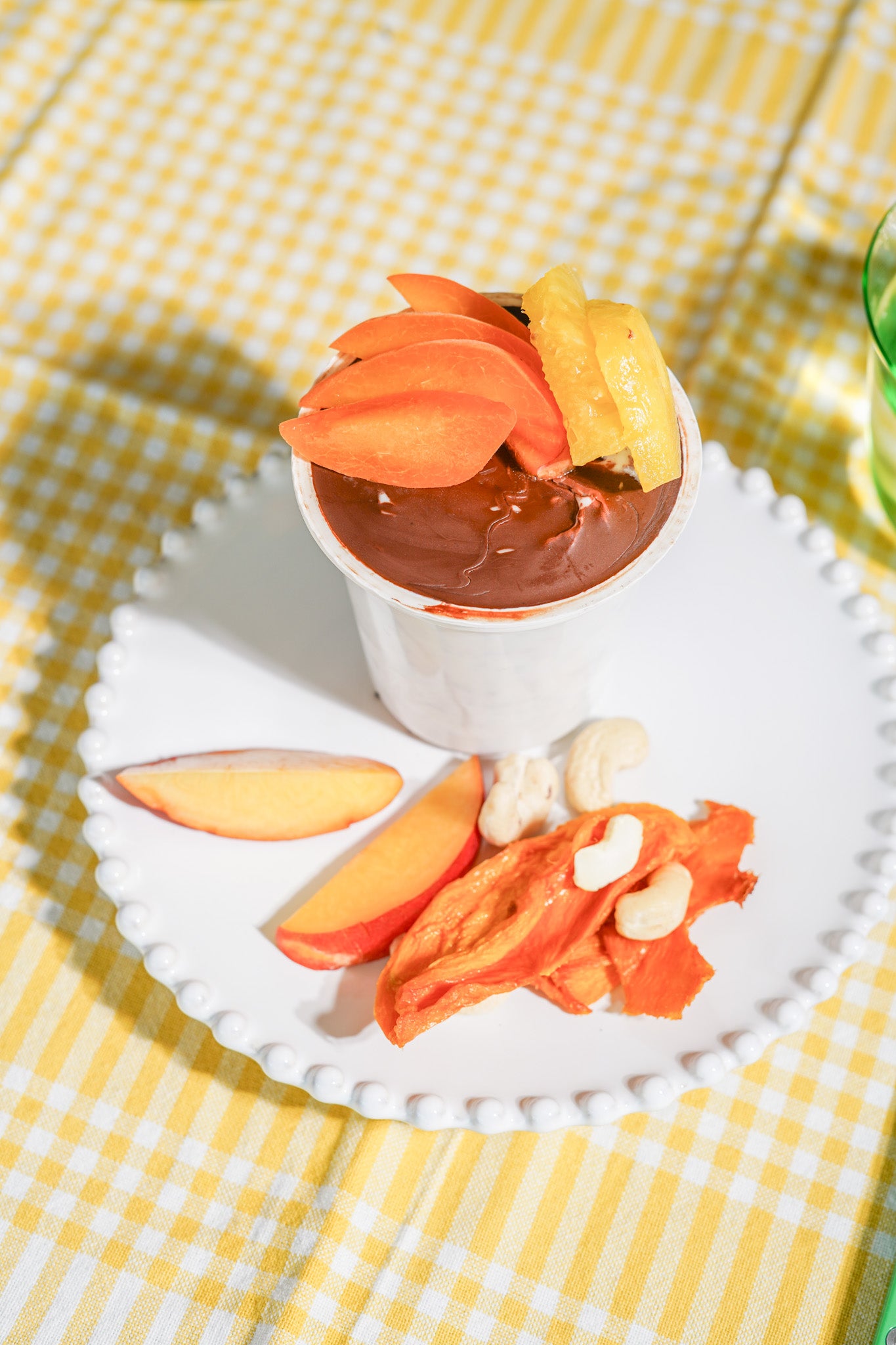 Ontbijt yoghurt met Chia, chocolade laagje, mango, nectarine en ananas