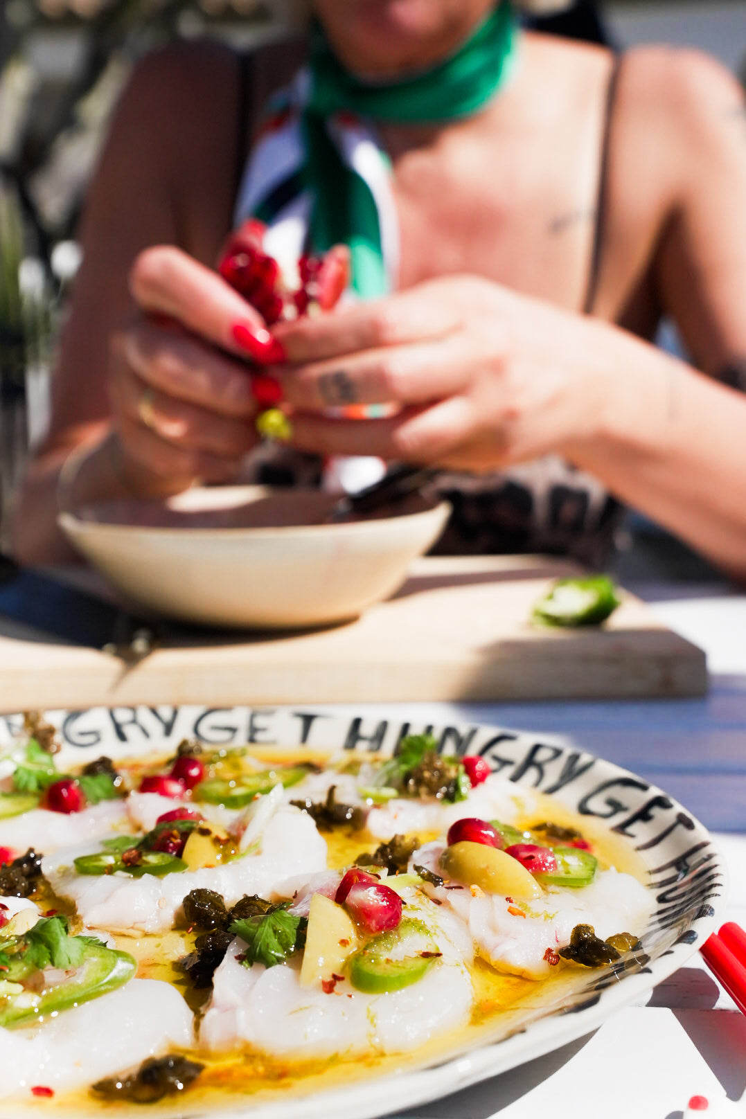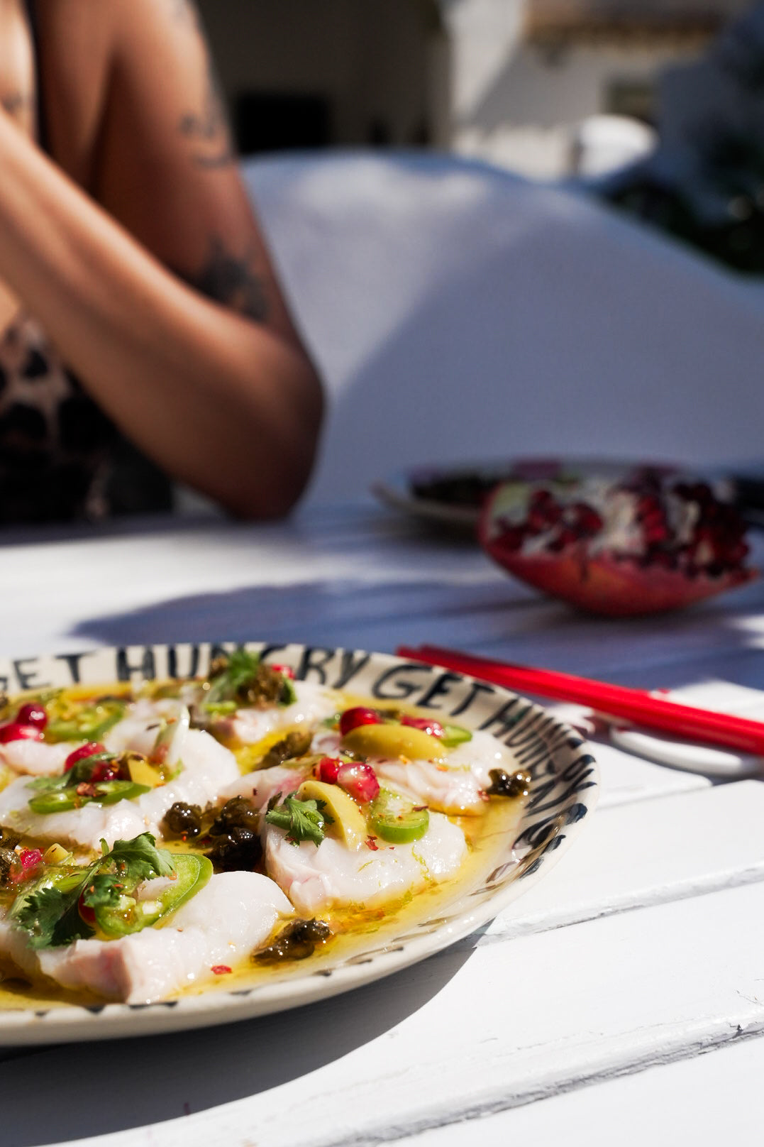 Afwerken & serveren: Haal de vis uit de koelkast en verdeel per sneetje wat kappertjes, stukjes olijf, granaatappel, een ringetje chili en een blaadje koriander. Lepel de marinade royaal over de vis.