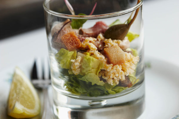 Vul glaasjes met een paar stukjes tonijn en kalfsfilet, wat ei en enkele snippers ansjovis.