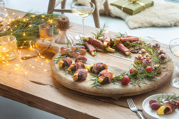 Rolls van filet d’Anvers, pompoen en abdij kaas: Leg de sneetjes Filet d’Anvers open en leg de kaas, notensla en butternut en fijngesneden augurk en een halve Grissini midden op het sneetje, rol ze op en leg ze op je plateau.