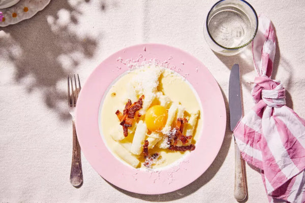 Verdeel de asperges carbonara over diepe borden, strooi de knapperige guanciale erover en leg in het midden nog een eidooier.