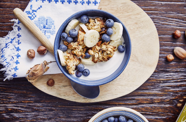 Banaan chocolade crunchies met hazelnoot yoghurt op Griekse wijze