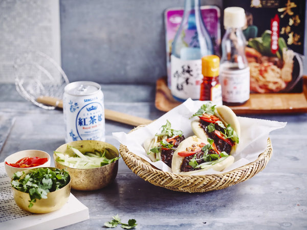 Plooi de warme buns wat open, vul met het stoofpotje, werk af met balkjes komkommer, verse koriander en chili in schijfjes.
