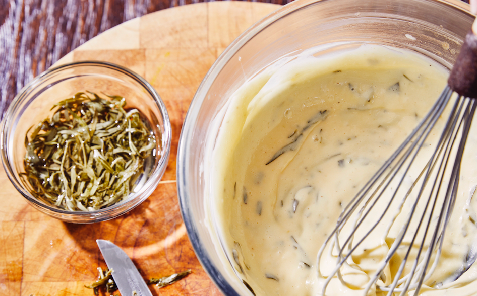 Bereid de Hollandaise saus. Knijp de blaadjes dragon lichtjes uit, snij ze fijn en roer ze onder de Hollandaise saus. Proef en kruid eventueel extra met peper en zout. Hou de saus warm in de bain-marie.