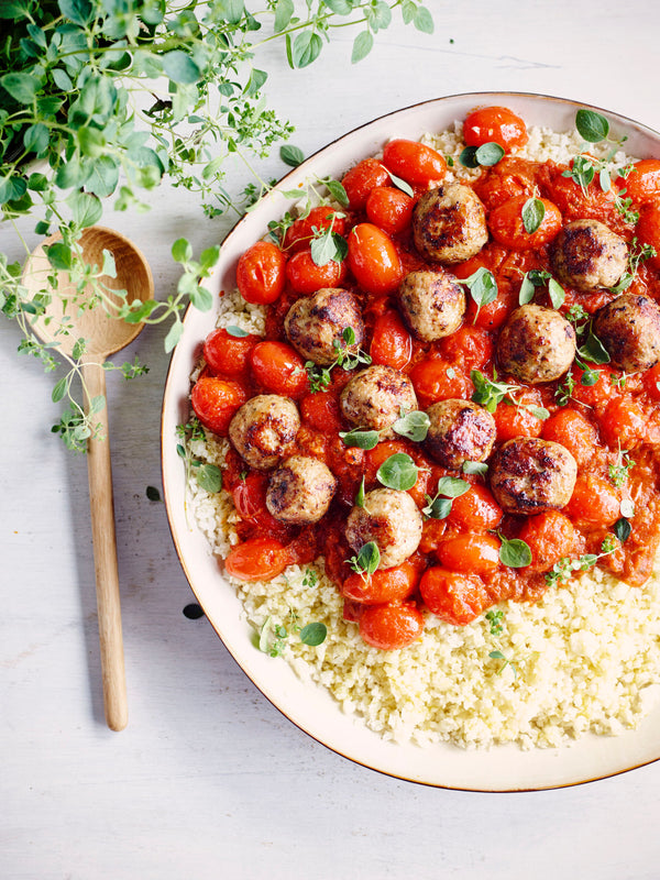 Bloemkoolrijst met gepofte tomaat en balletjes (en een geordende koelkast)