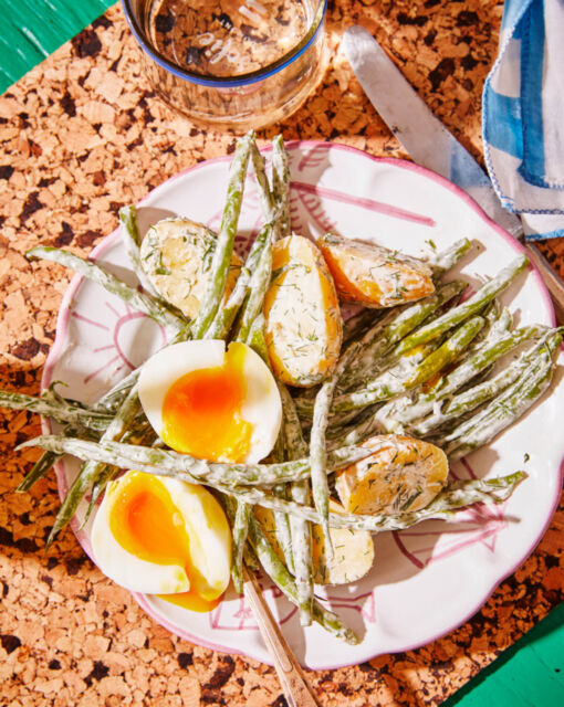 Salade samenstellen: Meng de krieltjes, boontjes en de dressing in een grote kom. Serveer de salade met de eitjes erbovenop.