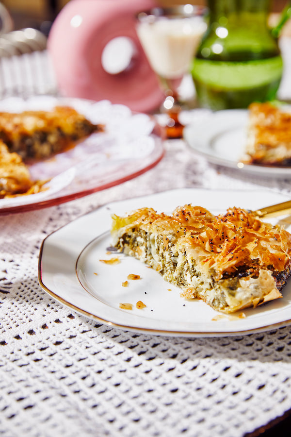 Leg een vel deeg open op een plank of plaat en bestrijk met boter.