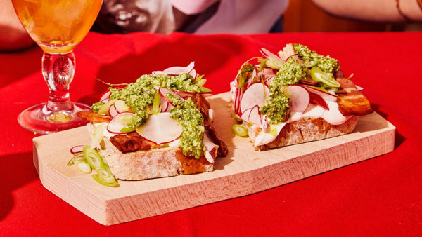 Besmeer de boterhammen royaal met platte kaas en leg op een plankje, kruid met peper en zout. Verdeel er al het spek en radijzen erover en dan lepeltjes pesto. Werk af met fijngesneden lente-ui.