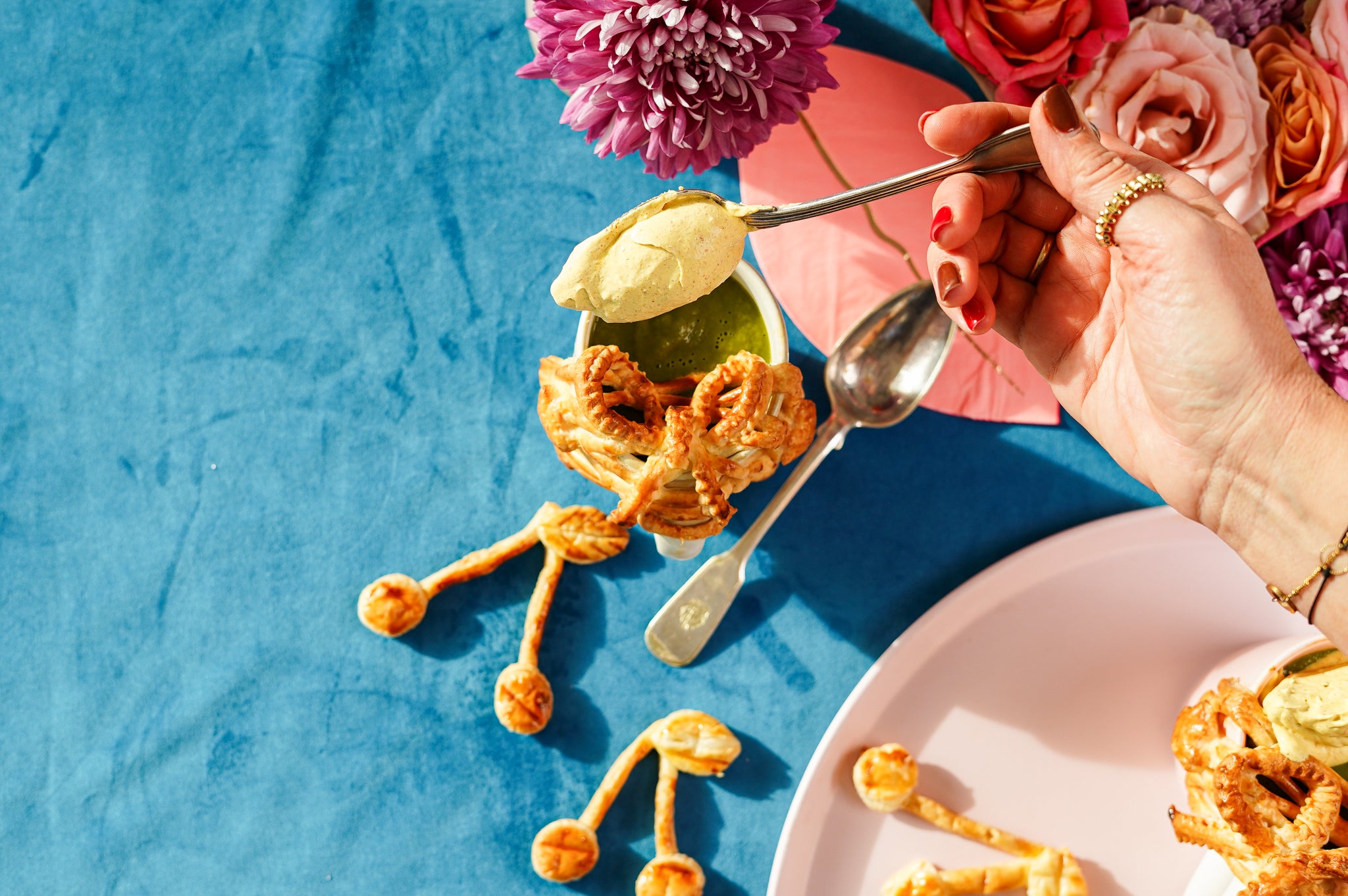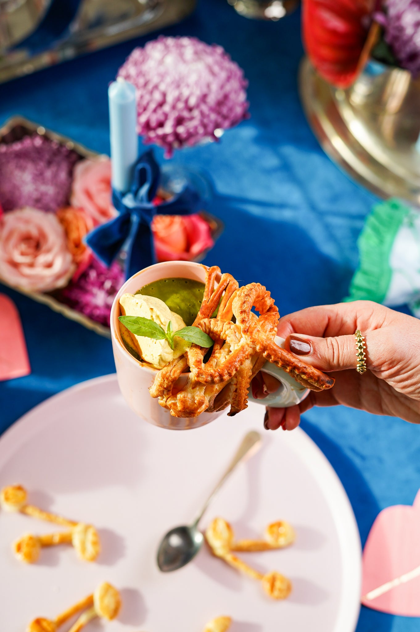 Serveren: Verwarm de soep opnieuw. Giet in de versierde tassen, werk af met een lepel curryroom en serveer met de bladerdeegstrikjes om te dippen.