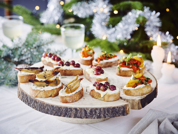 Snij de Coeur Fleuri in schijfjes en leg op de lauwe geroosterde sneetjes stokbrood, beleg met de druiven.