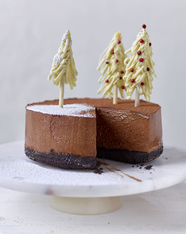 Ontvorm de taart en bestuif ze met cacao. Werk ze af met enkele dennenbomen en wat bloemsuiker en geef er de rest apart bij.