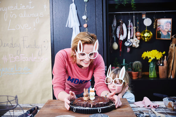 Smelt de paaschocolade samen met de kokosolie op een laag vuur. Neem van het vuur en roer regelmatig tot de chocolade volledig gesmolten is. Giet over in een glazen kom. Roer er het cacaopoeder door.