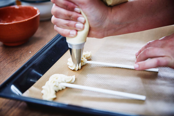 Doe in spuitzak met getande spuitmond, bekleed bakplaat met bakpapier, spuit een dotje deeg op het papier, leg een stokje erop en spuit er een snor op, ga zo verder met rest van het deeg.