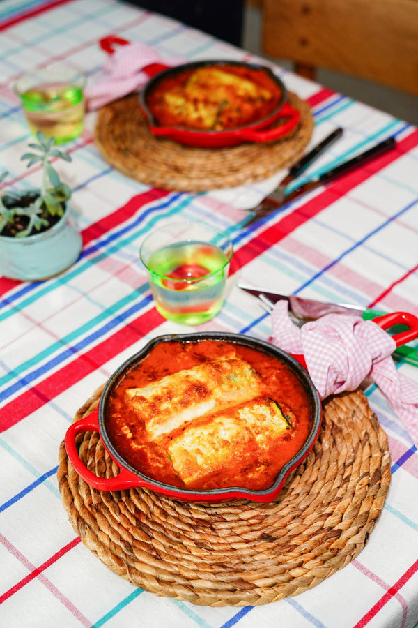 Courgette cannelloni met kippengehakt, ricotta en tomatensaus