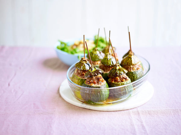 Snijd een hoedje van de courgettes, hol ze uit met een parisiennelepel en vul ze rijkelijk met gehakt. Smeer een ovenschaal met olie in en schik er de courgettes in. Maak de hoedjes vast met een satéstokje en bestrijk de courgettes lichtjes met olie. Schuif ze 35 min. in de oven.