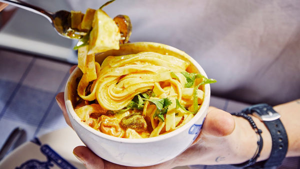 Voeg in een pan een beetje olie en je currypasta toe, breng aan de kook op laag vuur zodat de specerijen garen. Wanneer je veel curry ruikt, voeg je kokosmelk toe en laat het kort inkoken, niet te lang want dan krijg je een dikke bouillon. Kruid af naar smaak met peper, zout en suiker.