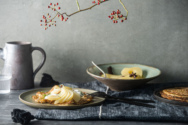 Leg 2 pannenkoeken per bord, leg op elke pannenkoek een dot yoghurt, snij de peertjes in waaiervorm, leg ze ook op de pannenkoek, en werk af met fijngesneden munt.