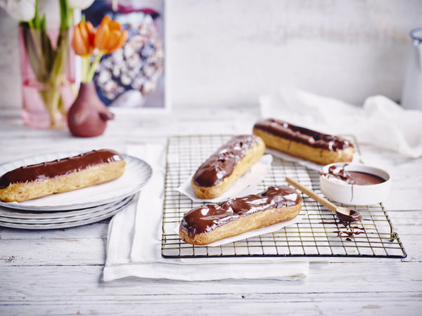 Maak onderaan elke eclair in het midden een gaatje met de ronde spuitmond.