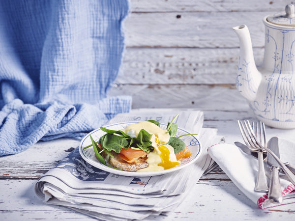 Leg bovenop de spinazie en werk af met een gulle lepel hollandaisesaus on top.