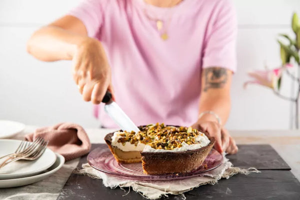 Zet je voorgebakken taartbodem in de oven, doe de vulling in een gieter of mengbeker met een gietmondje en vul de taart in de oven: zo kun je ze mooi tot bovenaan vullen zonder te morsen.