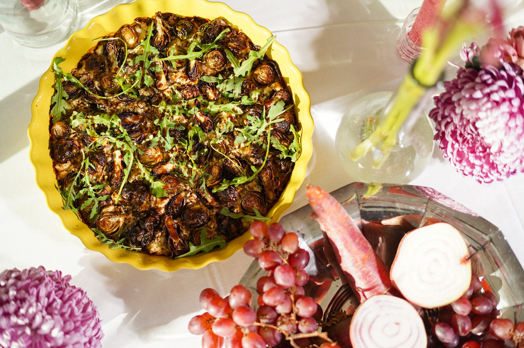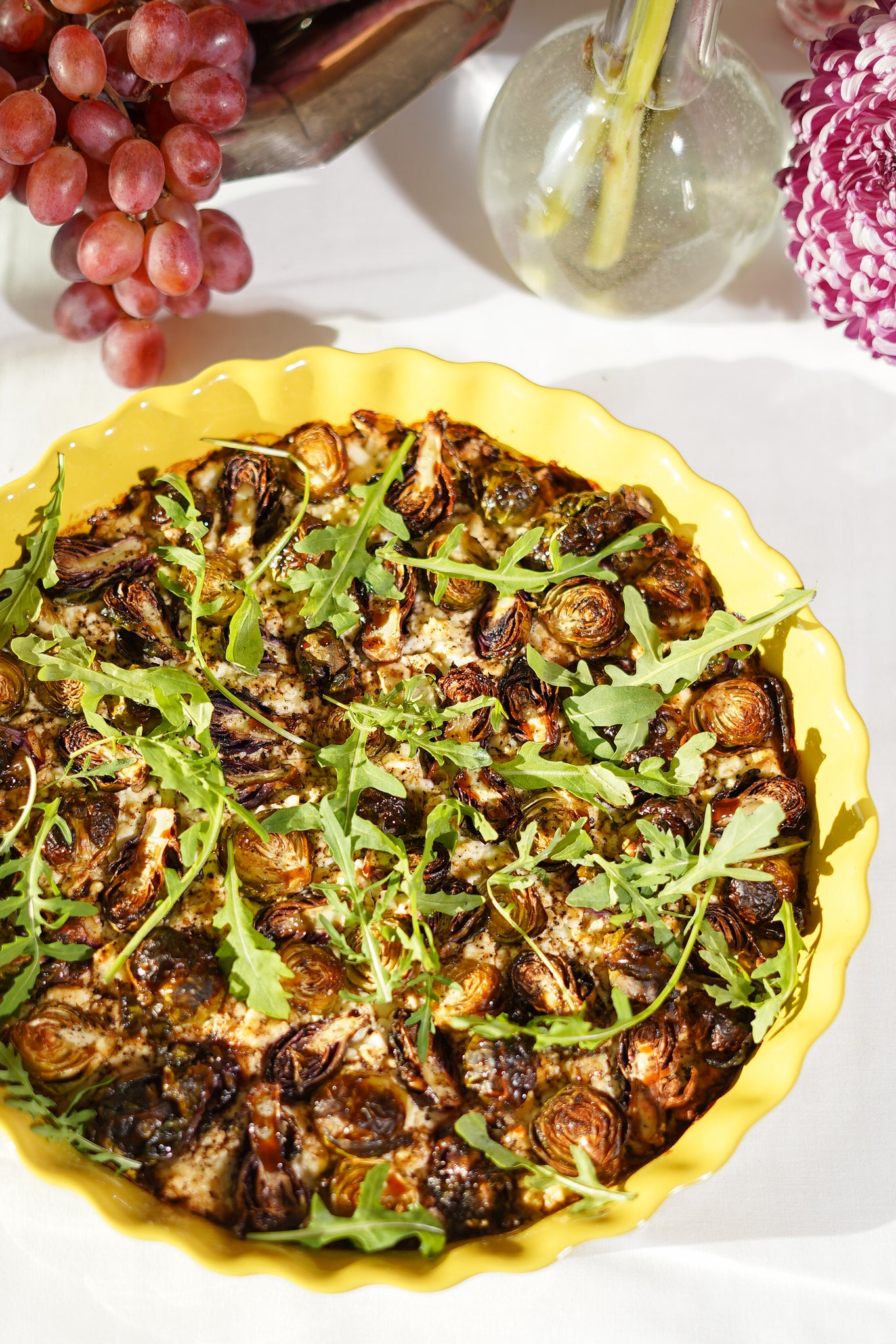Haal uit de oven, werk af met granaatappelmolasse, eventueel extra granaatappelpitjes voor een frisse crunch en een handvol rucola erbovenop voor kleur en pit.