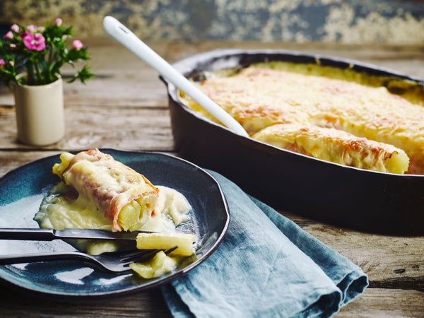 Doe je het zonder de hesp? Snij dan een gewassen prei volledig in de lengte door, stoom gaar en rol deze slierten rond de selder.