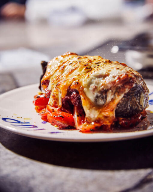 Heerlijke gegrilde aubergine melanzane met pittige tomatensaus en gesmolten scamorza, geserveerd op een frisse tomatensalade.