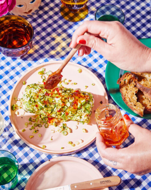 Doe de geitenkaas in een kom en voeg de afgekoelde, krokante knoflook, chili en sjalot toe. Kruid met fleur de sel en meng alles goed door elkaar.