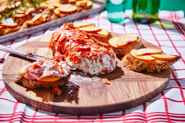 Geitenkaasrol met Chorizo op Crostini met Nectarines en Chili-Gember Pickle