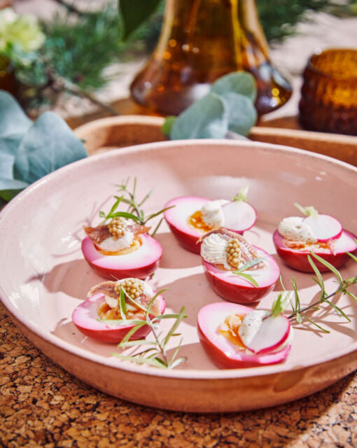 Afwerking: Halveer de gepekelde eieren en leg ze op een bord. Doe een klein dotje mosterdmayonaise op elk eitje en werk af met ansjovis, radijsjes en eventueel een takje rozemarijn voor een feestelijke uitstraling.
