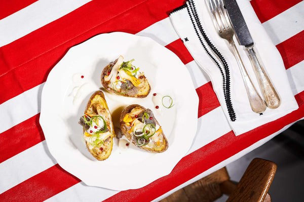 Snijd de bovenkant van elke gepofte aardappel af, of snijd voorzichtig doormidden zonder volledig door te snijden.