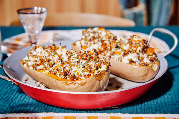 Snij de butternut in de lengte doormidden en haal de pitjes eruit. Hol nu de butternut helemaal verder uit tot overal 1 cm van de rand met een meloenschepje of met een koffielepel. Prik het vlees overal wat in met een satéstok en leg samen met het uitgeholde deel op een ovenplaat met bakpapier, kruid met peper en zout, besprenkel met olijfolie en steek 20 min in een oven van 200°C.