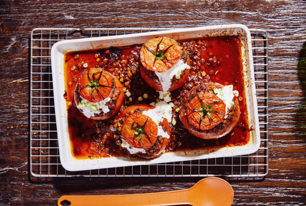 Zet de tomaten in een ovenschotel en vul ze ruim met de linzenmengeling. De rest van de mengeling verdeel je gewoon langs de tomaten. Zet 25 à 30 min in een voorverwarmde oven van 190°.