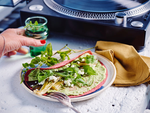 Leg er een strook prei en notensla op, werk af met de feta en fijn gesneden munt.
