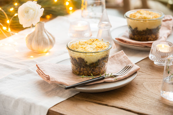 Bak één helft van de ui aan in klont boter en bak er het gehakt in gaar, laat het mooi kleuren en voeg jeneverbes toe, kruid met peper en zout, en verdeel het in 4 individuele vuurvaste potjes.