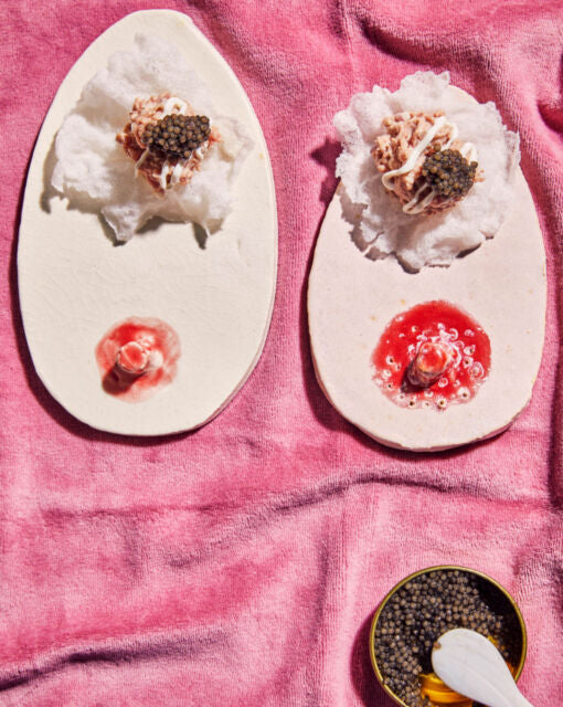 Doe de zure room in een spuitzakje. Maak quenelles van de tartaar en dresseer op de rijstvellen. Werk af met wat lijntjes zure room en een lepeltje kaviaar. Serveer onmiddellijk op je mooiste schoteltjes. 🙂
