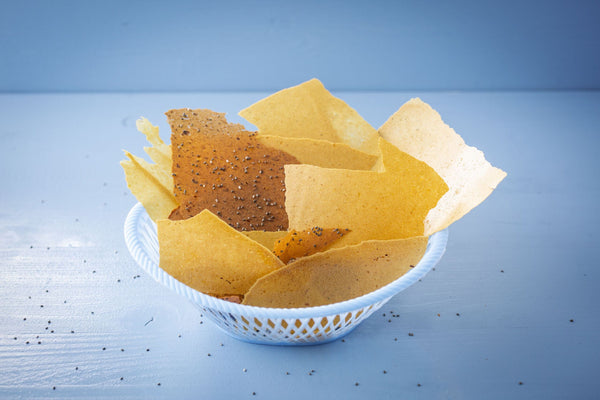 Mosterd en honing Als je geen paletmes hebt, kun je ook de rechte kant van een mes gebruiken. Gebruik de gladde kant van de antikleefmat. Je kunt de chips enkele dagen bewaren in een goed afgesloten doosje. Zoete aardappel In plaats van zaadjes kun je de chips ook garneren met gedroogde kruiden zoals basilicum of peterselie.