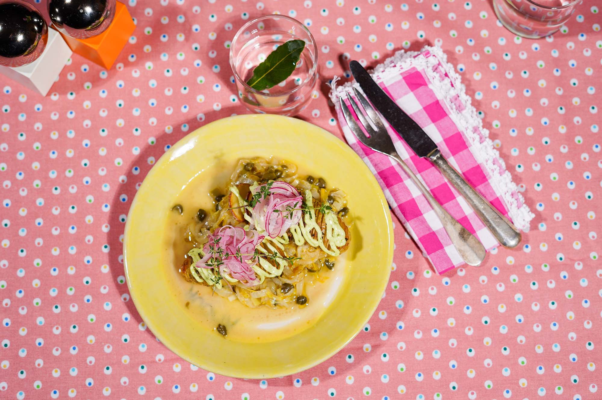 Werk af met dotjes of streepjes bieslookmayonaise, de gepekelde ui en eventueel een beetje gebruinde boter van de aardappelen errond.