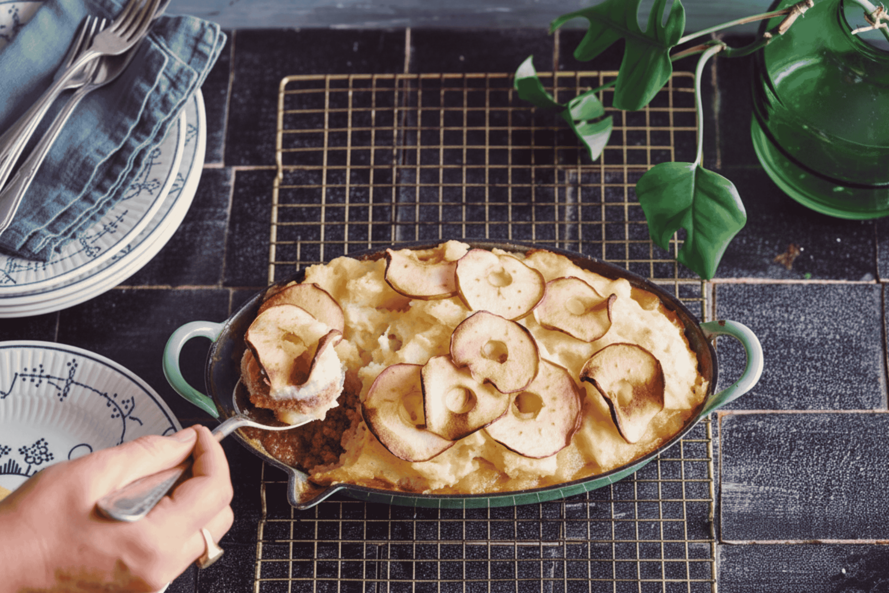 Bereid je aardappelpuree en verdeel schepjes op de appelmoes.