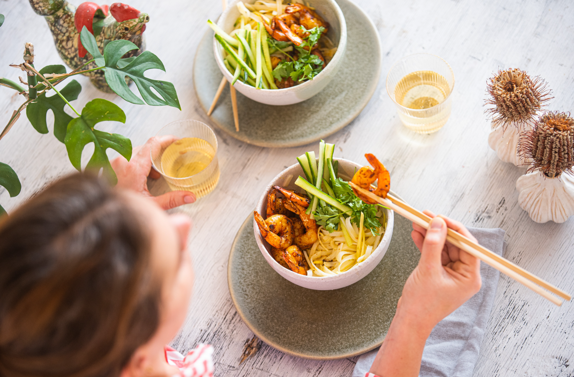 Indian curry, garnaalstaarten en gember noedels