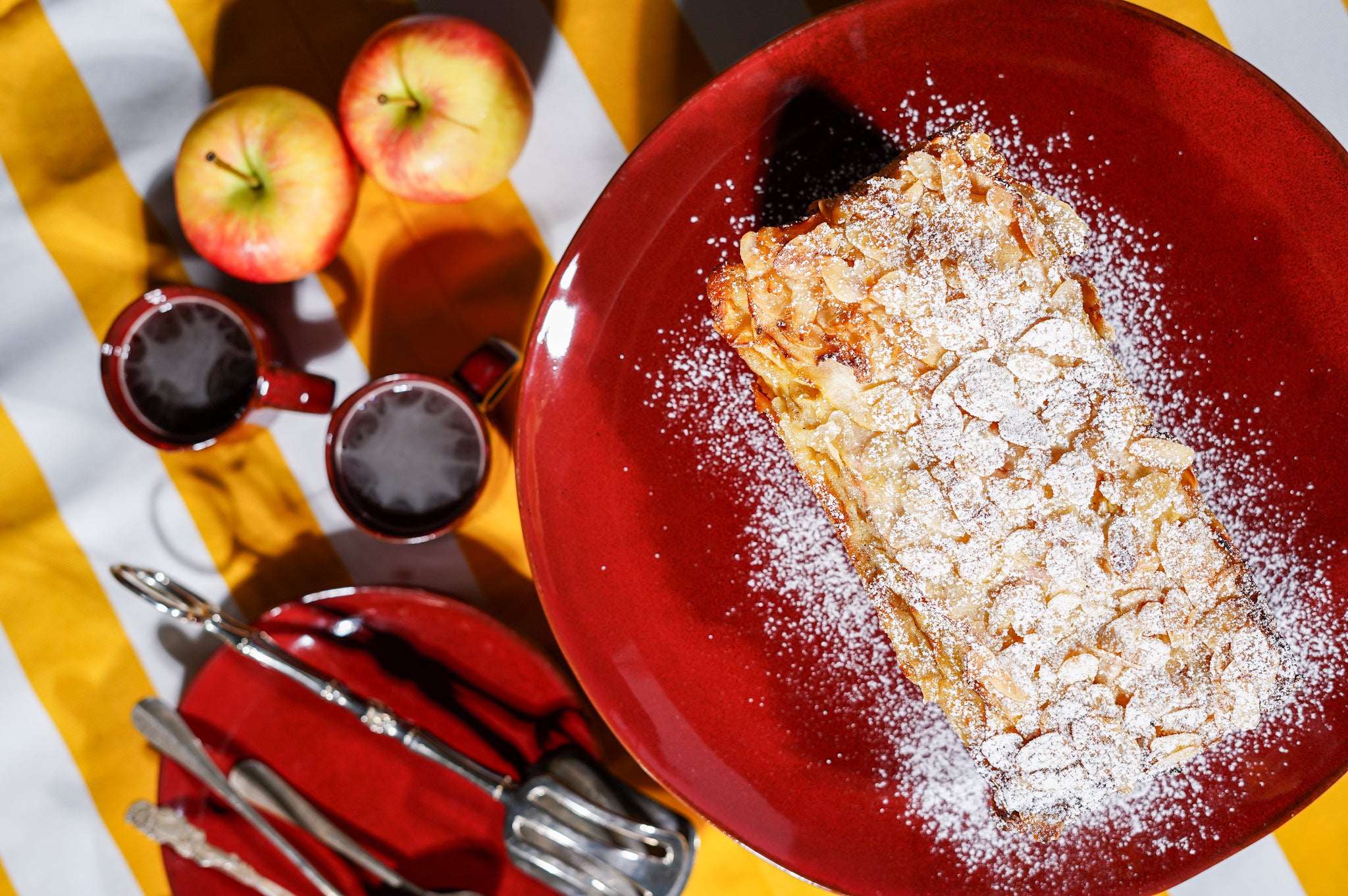Schep het mengsel in de cakevorm en druk lichtjes aan. Werk de bovenkant af met de overgehouden appelplakjes in trapvorm en bestrooi met geschaafde amandelen.