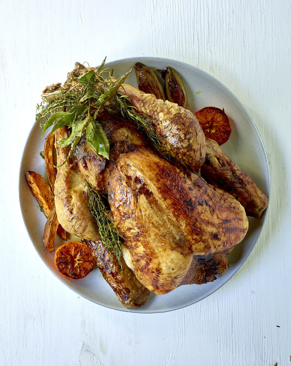 Haal de kalkoen uit de oven en laat de koolrolletjes en de zoete aardappelen gedurende 10 min verder garen in de oven.