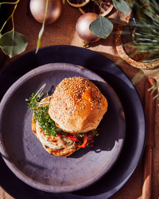 Kalkoenburgers met guanciale, pepermayonaise en gegrilde Provençaalse groenten