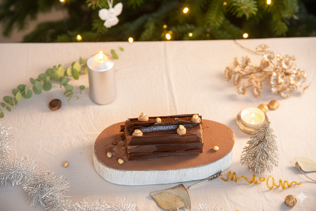 Een zachte chocolade rolbiscuit gevuld met heerlijke chocolademousse. Een makkelijk en spectaculair eindejaarsdessert.