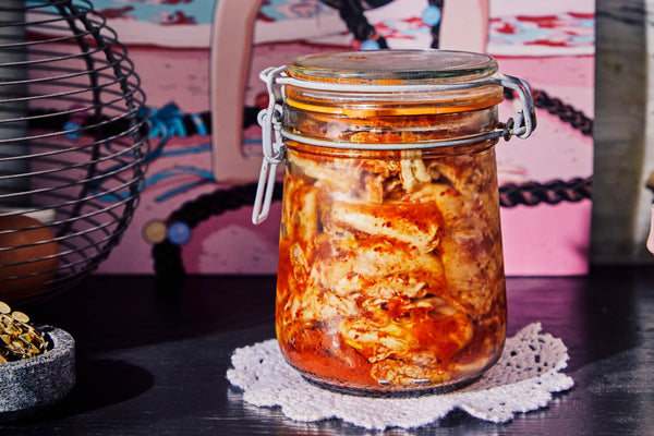 Laat de kimchi nu 2 tot 5 dagen op kamertemperatuur fermenteren. Omdat de kool door de fermentatie kan uitzetten, kun je het best een bordje onder de pot zetten, zodat het eventuele overlopende vocht opgevangen kan worden.
