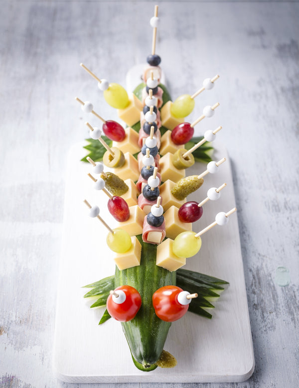 Steek een druif, een stuk olijf of een stuk augurk op een stokje en daarna een kaasblokje. Prik de stokjes in de rug van de krokodil.