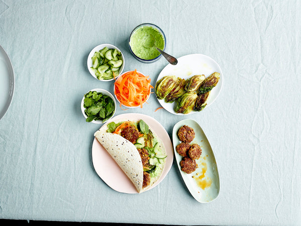 Warm de wraps op volgens de instructies op de verpakking. Zet de mini burgers, de rauwkost, de slaharten en de hummus apart op tafel, zo kan iedereen zijn eigen wrap naar eigen smaak vullen.